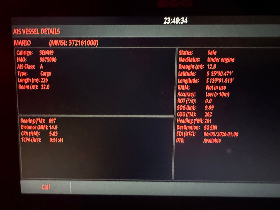 About midnight we were woken by the screeching of the VHF radio. I immediately turned to the handset in my bunk to check the alarm. It was an AIS (Automatic Identification System) alarm for an oncoming vessel. Upon inspection of the chart-plotter, we had a 225m, Singaporean registered cargo ship ‘Mario’ heading toward us on a collision course.
